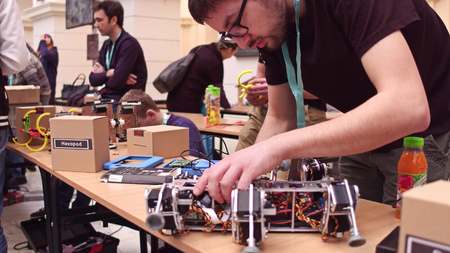 WARSAW, POLAND - MARCH, 4, 2017. Young nerdy man repairing DIY hexapod robot