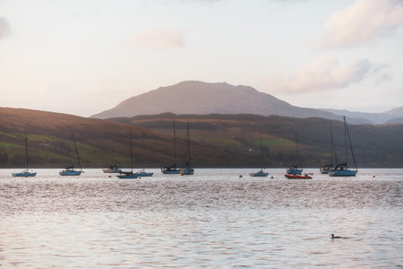 Yachts and wooden boats anchored on mooring near the shore of Gare Loch and a small village Rhu, Scotland, UK. Stunning sunset cloudscape. Travel destinations, vacations, leisure activity concepts