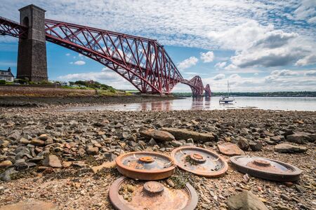 Forth Bridge from North Queensferry The famous Forth Cantilever Railway Bridge spans the Firth of Forth on a sunny day with old rusted steel wheels in the foreground