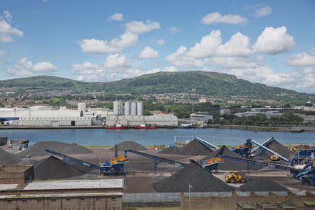 Belfast, Northern Ireland - June 9, 2017: A view across Belfasts dockland from HMS Caroline in the Titanic Quarter with Carrs glen and Napoleon's Nose in the background