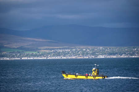 Yellow passenger boat under dark storm clouds in Scotland