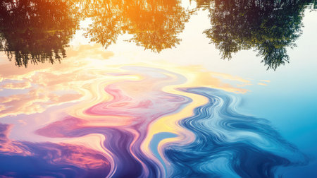 A mesmerizing reflection captures vibrant colors of the sky in a quiet water surface, surrounded by lush trees. The scene exudes tranquility and beauty.