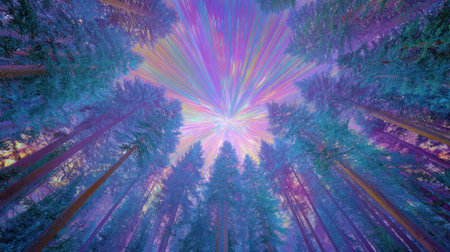 Tall trees surround a magical sky bursting with colors creating an enchanting atmosphere at dusk.