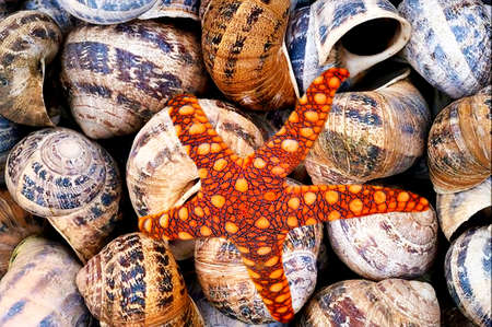 Close-up of a collection of colorful and textured sea shells, showcasing natural beauty.