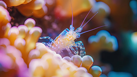 A close-up of a shrimp camouflaged among the coral, its transparent body blending in with the environment.
