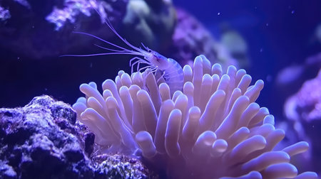 A close-up of a shrimp cleaning a coral polyp in a symbiotic relationship
