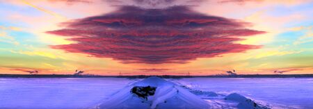 winter landscape red sunset on the ice of the river and and pipe plant on the horizon