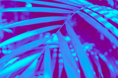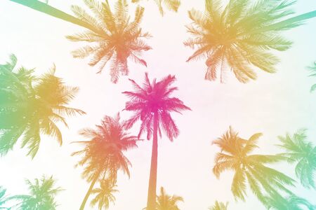 Palms with pink pop art effect. Vintage stylized photo with light leaks. Summer palm trees over sky on beach. Holiday and travel concept. Copy space.