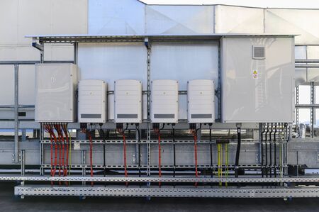 Close up Inverter solar panel and Solar system of Solar panels or Solar cells on factory or building rooftop or terrace with sun light, Sun or renewable or Clean energy.