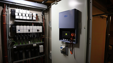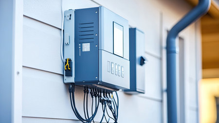Close-up of a solar inverter and meter box mounted on the side of a house, with cables neatly arranged.