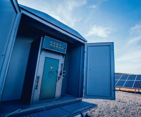 Rows of energy storage units in a field representing a battery farm. Concept of sustainable power grid and green alternative energy solution.