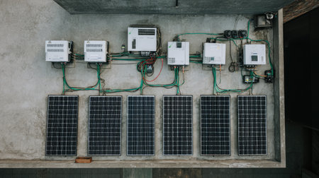 A detailed view of a solar panel installation featuring solar panels and inverters arranged methodically on a rooftop. This image highlights the importance of renewable energy solutions.