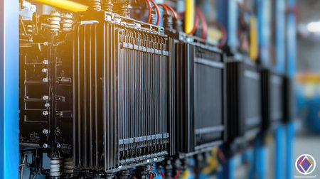 Electrical transformers and power distribution systems in a South Asian factory, close-up, no people, copy space.
