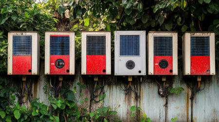 A collection of weathered solar-powered devices displaying technology in an urban setting, surrounded by lush green plants, emphasizing sustainability and nature's integration.