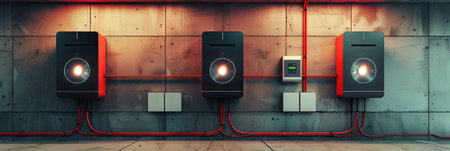 electrical panel with a vibrant orange control box, showcasing modern industrial design and advanced technology. The intricate line work and components are the focus of this image.
