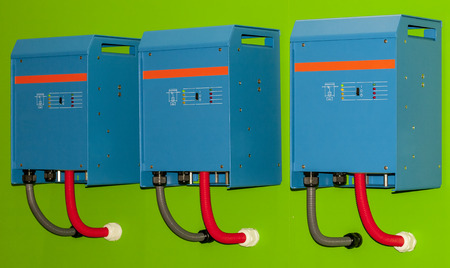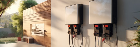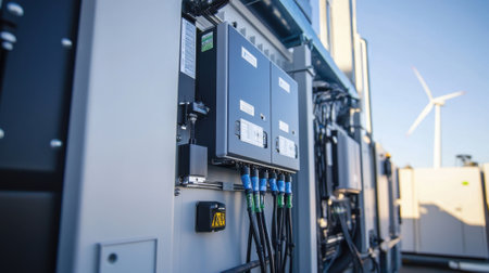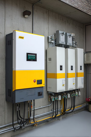 The image features solar energy equipment, consisting of white and yellow boxes attached to a wall. Black cables connect the units, likely for power distribution. The composition displays various electrical components and wiring against a neutral background. Suitable for illustrative use in renewable energy contexts and technical documentation.