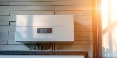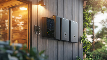 Solar inverter mounted on the wall of a residential home. Solar energy or go green concept.