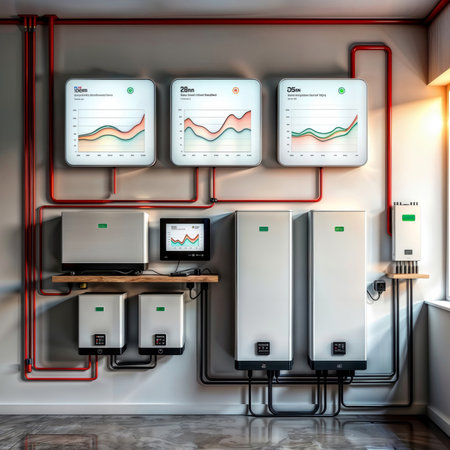 Home energy storage system. The image shows a modern residential energy storage system with battery units, displays showing charge/discharge graphs, and red piping.