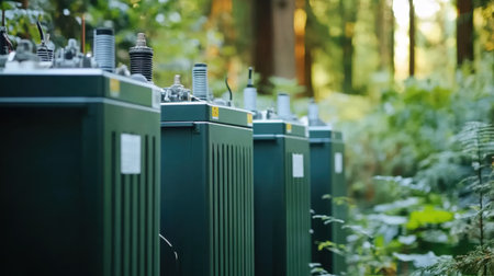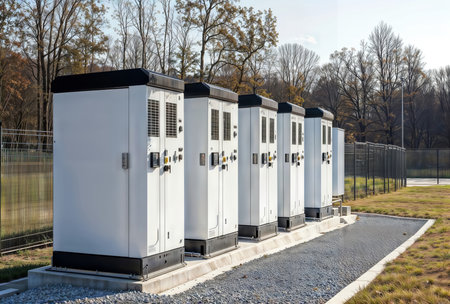 Outdoor Energy Cabinets. A series of white energy storage cabinets in a fenced area, surrounded by trees.