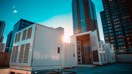 Rooftop power and data cabinets on urban skyscraper with city skyline at sunset.