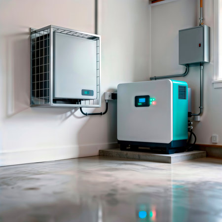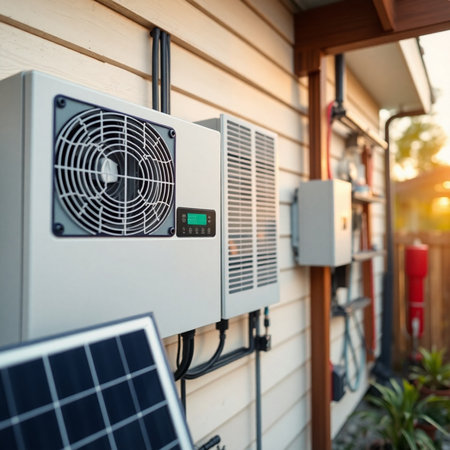 A compact home battery system mounted on a wall next to solar inverters and monitoring panels