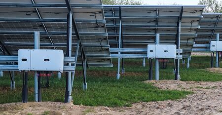 Inverter and store energy building. Solar cell park. Background