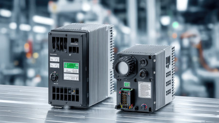 This image captures a pair of modern industrial drives designed for automation and control, highlighting their intricate features and robust design in a sophisticated manufacturing setting.