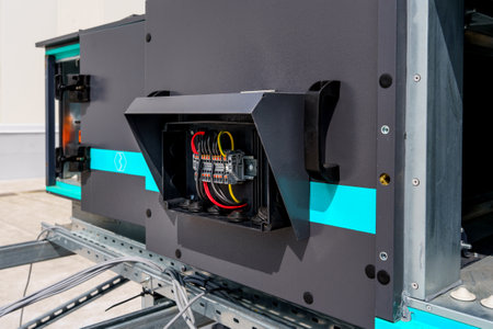 Detail of a rear portion of a LED LCD wall or stage panel. Display system for concerts, with visible rear panel with power and signal connectors visible.