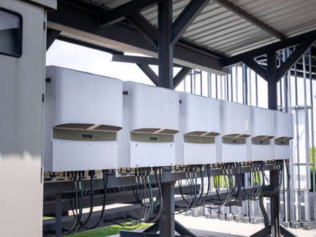 Inverter solar panel and Solar system of Solar panels or Solar cells on factory or building rooftop or terrace with sun light, Sun or renewable or Clean energy.
