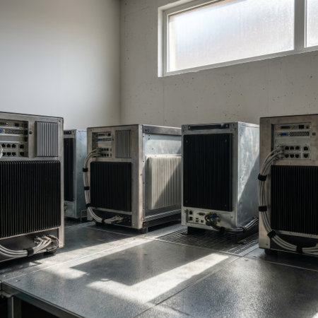 A row of rugged industrial computers sits on a raised metal floor in a stark, concrete server room, illuminated by natural light from a high window casting long shadows.