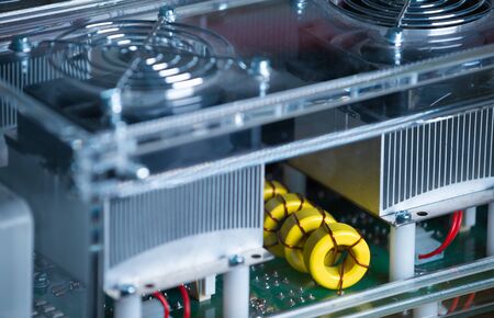 Close up of the metal mesh cases of power supply and wires are on a wooden table at the production of high-tech computers. Concept High Tech and Computer
