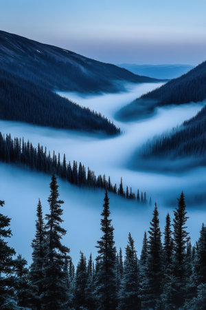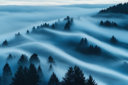 Mystical misty landscape of dense fog rolling over hilly forested terrain with layered pine tree silhouettes in a serene tranquil and atmospheric setting