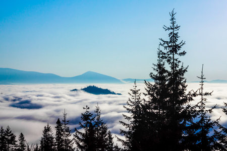 View of fog down in the valleys at sunrise in mountains Carpathians in Ukraine