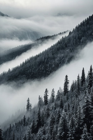 Forested mountain slope in low lying cloud with the evergreen conifers shrouded in mist in a scenic landscape view