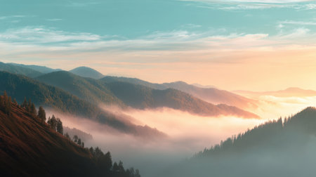 This captivating image showcases a tranquil morning in misty mountains, where soft light dances over layered hills and evergreen trees, creating a serene atmosphere.