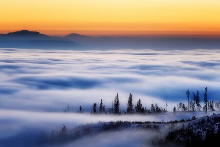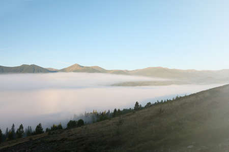 Foggy sunrise in the mountains. Landscape with fog and clouds.