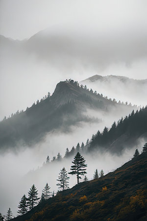 An AI generated illustration of an idyllic landscape featuring tall trees shrouded in a misty fog in the mountainous terrain