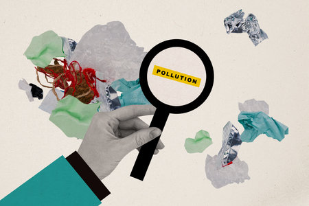 Abstract creative collage hand with magnifying glass looking at garbage pollution planet trash environment destruction ecosystem