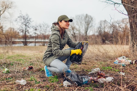 Woman volunteer cleaning up the trash in park. Picking up litter outdoors. Ecology and environment concept. Challenge
