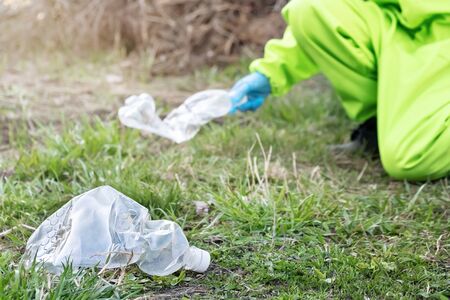 Hands picking up trash outdoors. Volunteers cleaning trash outdoor. Plastic waste pollutes the planet.