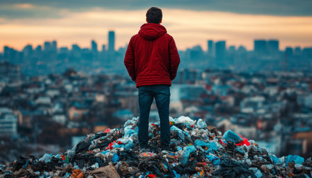 A man in a red jacket stands atop a garbage mountain, gazing at the city skyline in the distance.