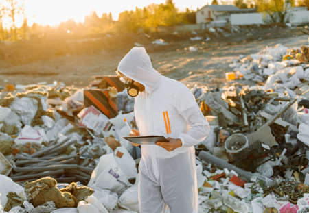 Researcher looking at plastic landfill analyzing environmental pollution level