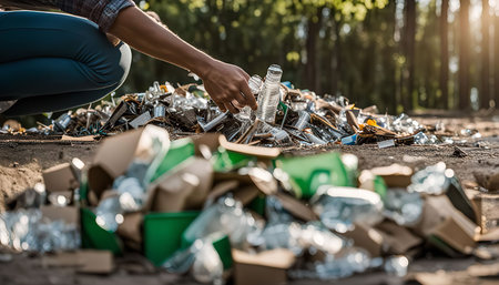 A volunteer is picking up plastic bottles and other garbage in a forest, helping to clean up the environment.