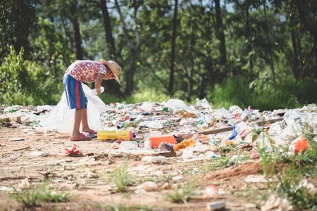 A poor boy collecting garbage waste from a landfill site in the outskirts, the lives and lifestyles of the poor, Child labor, Poverty and Environment Concepts