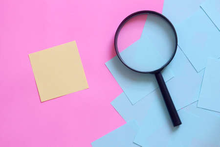 Notes idea concept with colorful sticky notes, magnifier on cyan blue background flat lay. man looking at a note with magnifier. horizontal image