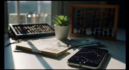 A stack of US dollar bills next to a smartphone displaying a stock chart with paperclips on top.