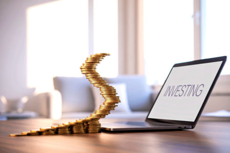 A curved stack of gold coins represents a growing investment portfolio, positioned next to a laptop displaying the word INVESTING. The image suggests online investment opportunities.