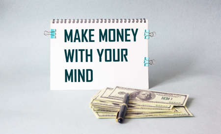 Text MAKE MONEY WITH YOUR MIND on a notebook, next to dollars and a pen