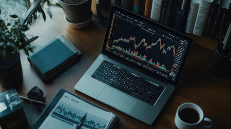 Stock movement charts fill the laptop screen as coffee and documents rest nearby.
