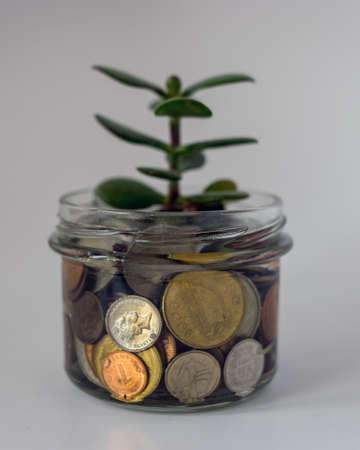 photo of a glass jar with money and a money tree in it, plant growing on coins glass jar and concept money saving coins